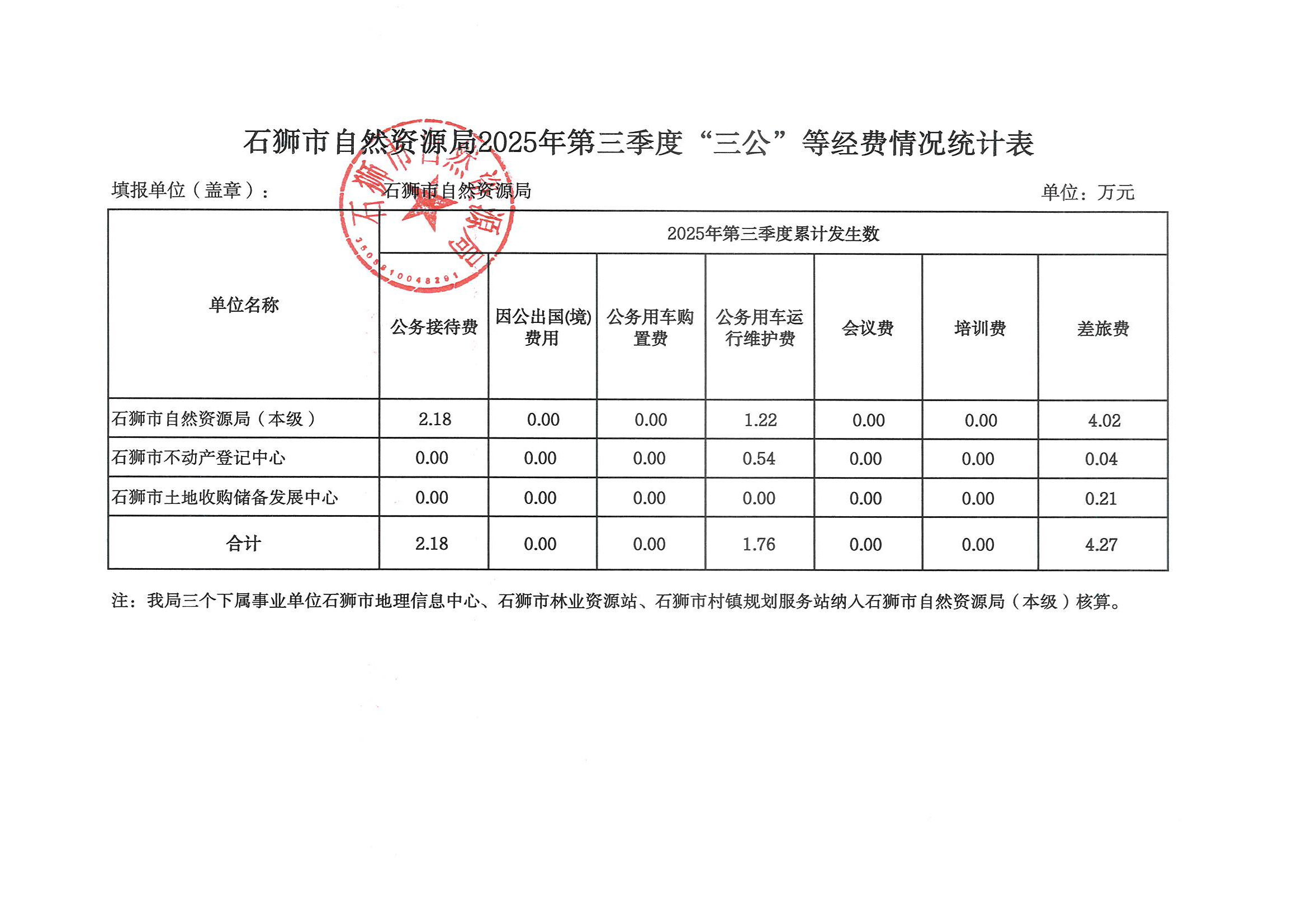 自然资源局2025年第三季度“三公”等经费情况统计表