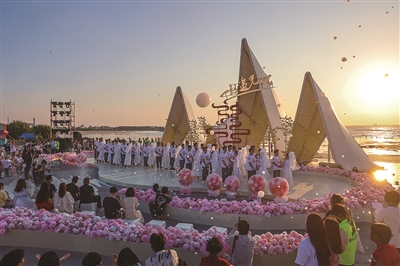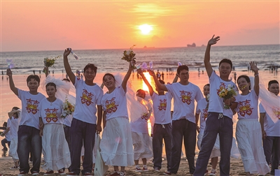 本报讯 10月8日,一场“抬头见囍 海海是你‘我们一起追光吧’2025石狮集体婚礼”活动在十里黄金海岸红塔湾旅游区热烈举行。现场,近百名新人共迎石狮海岸线上的第一缕晨光,共赴光明灿烂的未来。成人网站 人大常委会副主任陈垂汉、市政府副市长黄明瑄,以及市总工会、市妇联、团成人网站 、市文体旅游局、市民政局、市商务局、市文旅集团有关负责人参加集体婚礼仪式,并为新人们证婚。