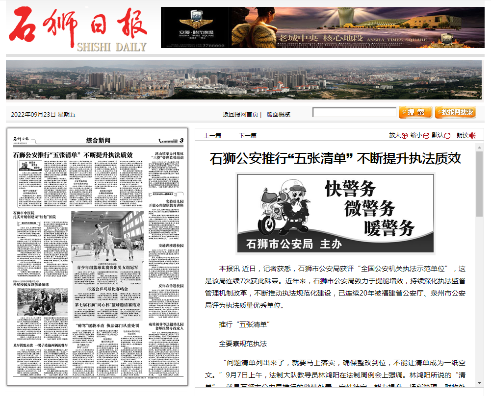 公安局与《泉州晚报》《石狮日报》均签订协议,设立“平安石狮”板块,及时发布政策解读。今年来依托主流媒体,发布政策性信息共计900余条。