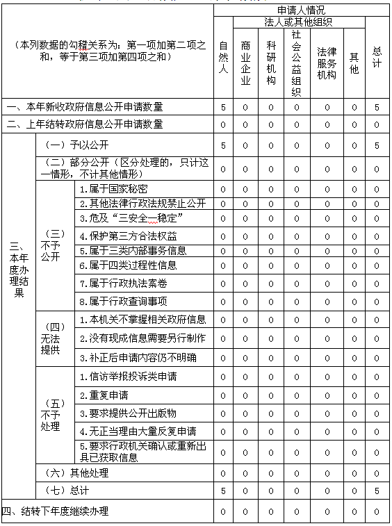 (二)依申请公开情况。为积极稳妥地做好社会公众提出的政府信息公开申请,我局具体明确了依申请公开政府信息的申请受理机构、申请提出方式、申请受理流程、服务方式和内容,进一步规范申请受理程序,明确操作要求和办结时限等,规范依申请公开工作机制.全年共办理依申请公开来信5件,全部按规定及时回复。