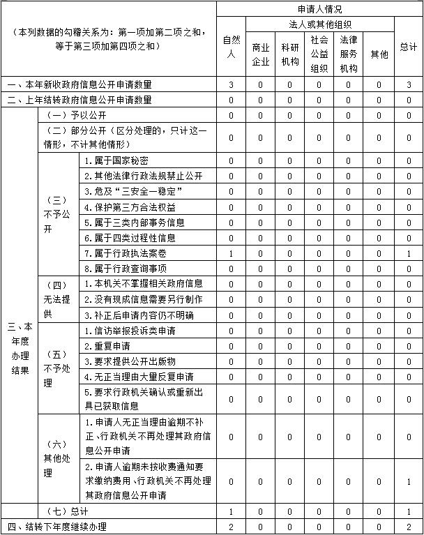 (二)依申请公开情况。依法、依规办理依申请公开信息3件,办结及时率100%,其中予以公开0件,部分公开0件,不予公开1件,无法提供0条,无法处理0条,结转下年度2件。2021年我单位未发生因政府信息公开被申请行政复议、被提起行政诉讼的情况。