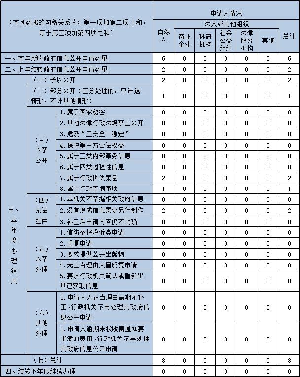 (二)依申请公开情况。畅通依申请公开受理渠道,依法保障公众合理的信息需求,严格按照法定时限答复。本年度共收到依申请公开信息6件,去年结转2件,办结及时率100%。2022年我单位未发生因政府信息公开被申请行政复议、被提起行政诉讼的情况。