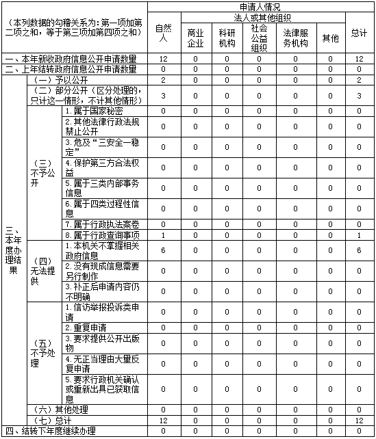 2019年,我局收到依申请公开事项12项,其中,同意公开2项,同意部分公开3项,不同意公开1项,不属于本行政机关公开4项,申请信息不存在2项,以上12项我局均按规定予以答复。