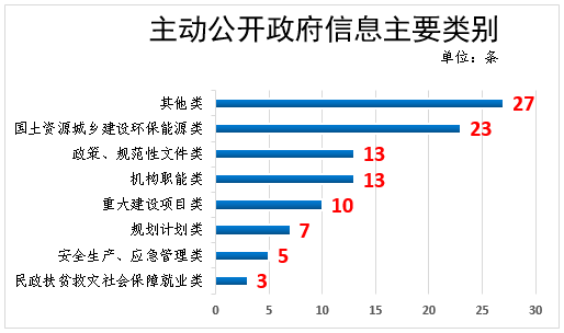 (一)主动公开政府信息情况。2019年,我办在市政府网站政府信息公开目录共主动公开政府信息101条,发布及时率100%。其中机构职能类信息13条、占12.9%,政策、规范性文件类信息13条、占12.9%,规划计划类信息7条、占6.9%,重大建设项目类信息10条、占9.9%,民政扶贫救灾社会保障就业类信息3条、占3%,国土资源城乡建设环保能源类信息23条、占22.8%,安全生产、应急管理类信息5条、占4.9%,其他类信息27条、占26.7%。