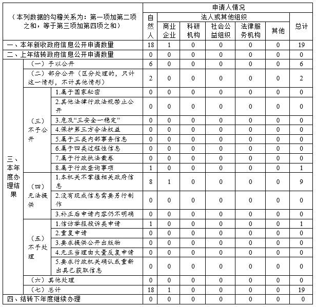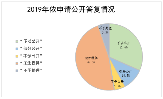 (二)依申请信息公开情况。2019年,我办共受理依申请公开19件,申请人为自然人18个以及商业企业1家,受理方式为信函申请10件、网络申请9件,主要涉及安征迁、工程项目等方面,其中“予以公开”6件;“部分公开”2件;“不予公开”1件,属于行政查询事项;“无法提供”9件,主要是我办不掌握相关政府信息;“不予处理”1件,主要是申请人以政府信息公开申请形式提出与政府信息公开无关诉求。2019年,我办未发生因政府信息公开被申请行政复议、被提起行政诉讼情况。