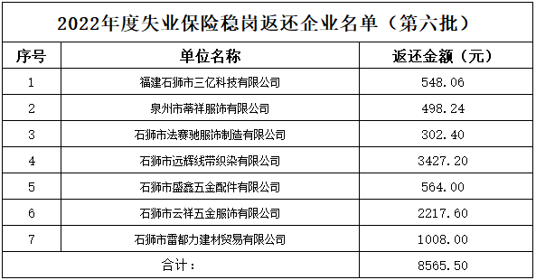 附件:2022年度失业保险稳岗返还企业名单(第六批)