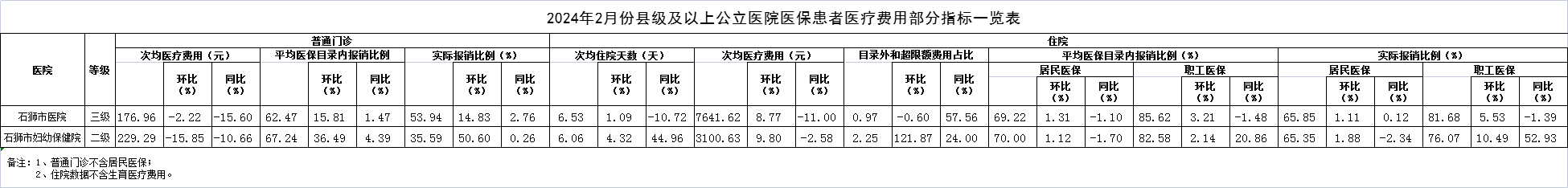 2024年2月份县级及以上公立医院医保患者医疗费用部分指标一览表