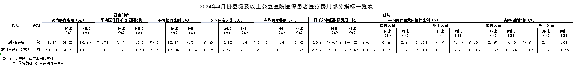2024年4月份县级以上公立医院医保患者医疗费用部分指标一览表
