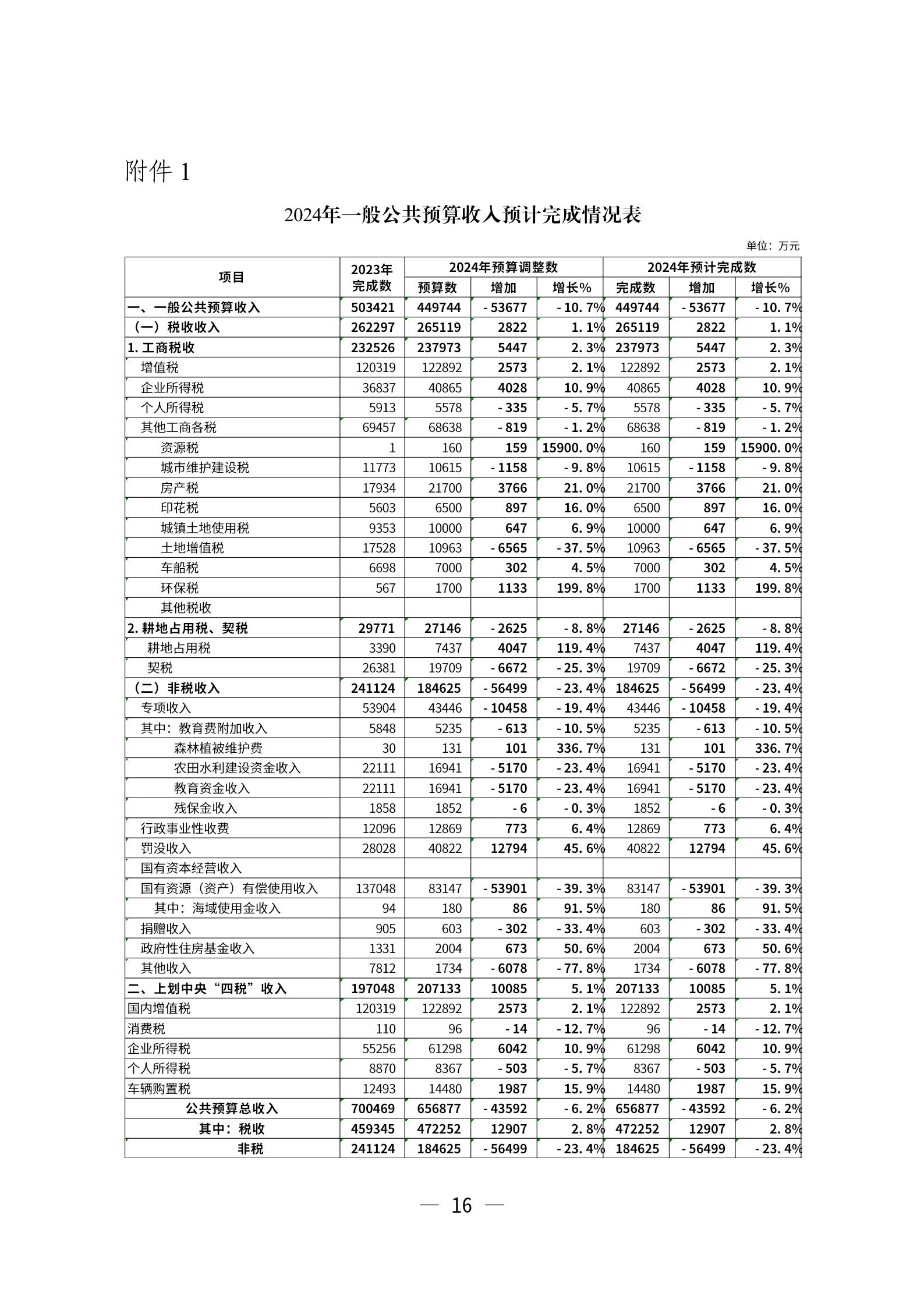 税收收入47.23亿元、增长2.8%。其中增值税24.58亿元、增长2.1%,企业所得税10.22亿元、增长10.9%,个人所得税1.39亿元、下降5.7%,其他工商各税6.86亿元、下降1.2%,耕占税0.74亿元、增长119.4%,契税1.97亿元、下降25.3%。2024年企业所得税、耕地占用税、车购税是主要增收税种,其中企业所得税主要是重点企业成本下降、利润增长;耕地占用税主要是耕占税清理0.41亿元;车购税主要是以旧换新补贴与税收优惠政策拉动消费增长。土地增值税、契税是主要减收税种,主要是受房地产下行、增量房交易减少等因素影响。非税收入18.46亿元、下降23.4%,主要是近年来我市加大盘活存量资产资源,继续保持资产盘活力度难度加大,2024年国有资产处置收入减收5.39亿元。
