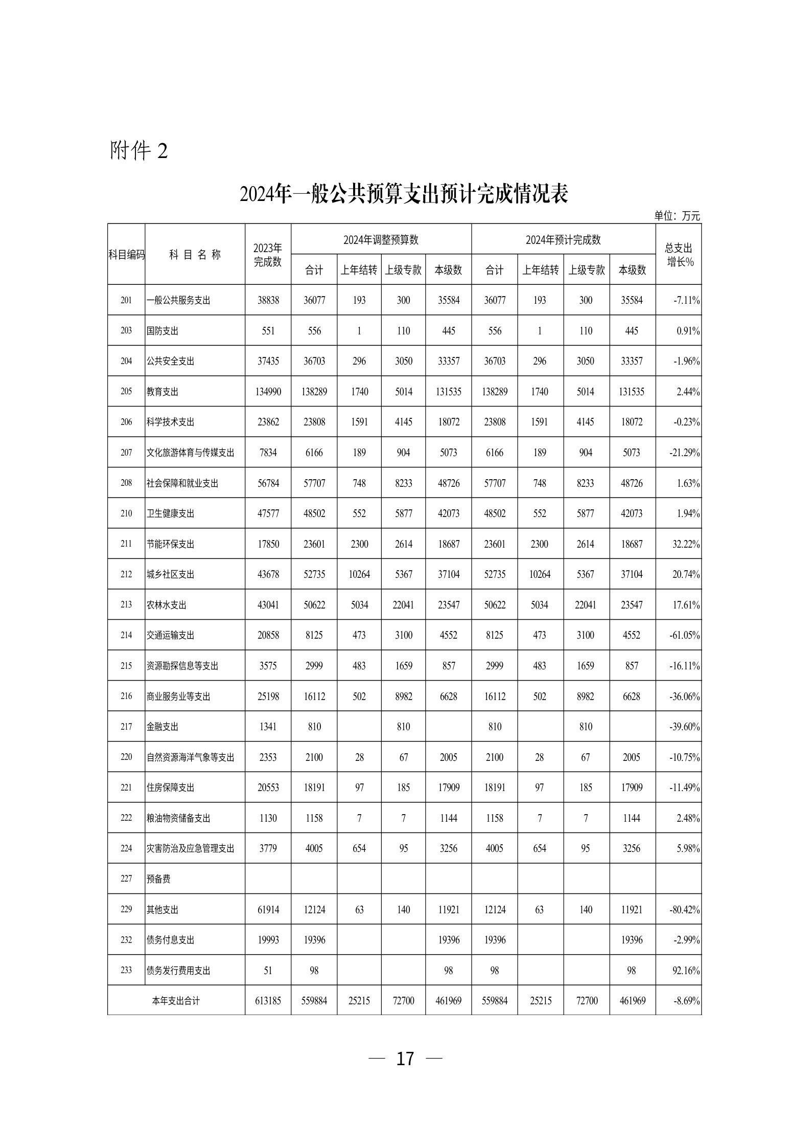 一般公共预算支出55.99亿元,下降8.7%,其中:上年结转支出2.52亿元;上级专项补助支出7.27亿元;本级财力支出46.2亿元,主要为:一般公共预算收入44.97亿元、返还性收入2.39亿元、一般转移性收入1.42亿元、地方政府债券收入11.18亿元、调入资金(含政府性基金及预算调节稳定基金等)4.78亿元等合计64.74亿元,扣除专项上解3.85亿元、体制上解2.01亿元、对口援宁专项0.18亿元、地方债券还本12亿元、调出资金0.5亿元等合计18.54亿元。相应安排支出46.2亿元,收支平衡。