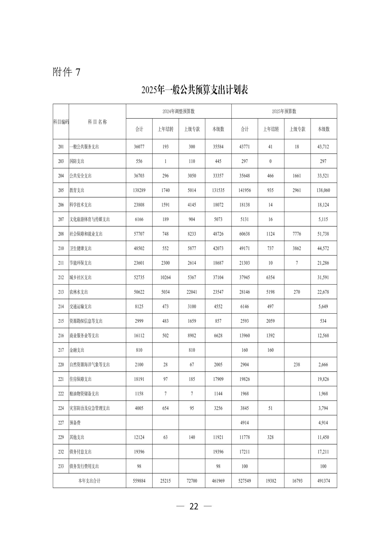 (3)平衡情况。2025年总财力52.76亿元,其中:上年结转1.94亿元;上级专项补助1.68亿元;本级财力49.14亿元,主要为:一般公共预算收入46.75亿元、返还性收入2.39亿元、一般转移性收入1.62亿元、地方政府债券收入2.9亿元(含再融资债券2.6亿元及预安排一般债0.3亿元)、调入资金(含预算稳定调节基金等)5亿元等合计58.66亿元,扣除专项上解4.28亿元、体制上解2.01亿元、援宁支出0.18亿元、地方债券还本3.05亿元等合计9.52亿元。相应安排本级支出49.14亿元,实现收支平衡。