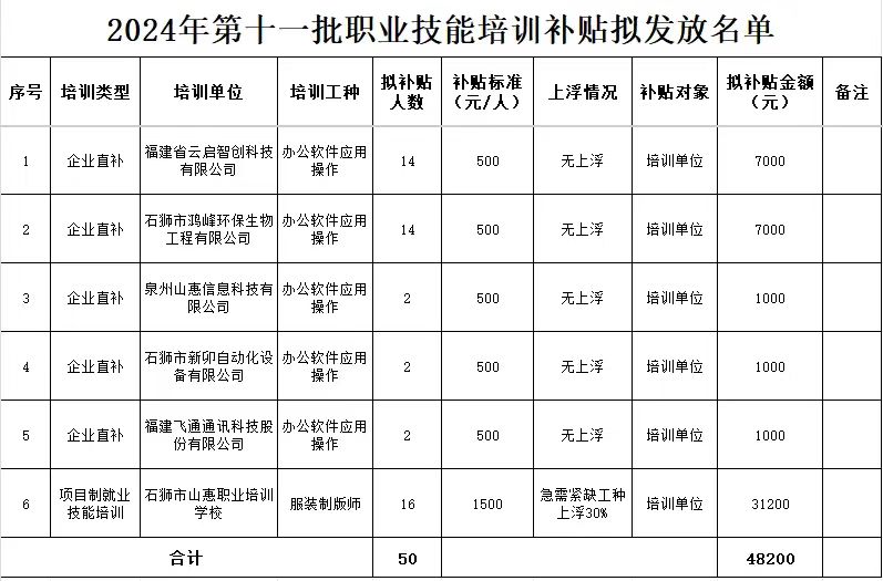 根据《福建省人力资源和社会保障厅福建省财政厅关于就业补助资金技能培训补贴项目使用职业培训券结算有关事项的通知》(闽人社文〔2023〕153号)、《福建省人力资源和社会保障厅关于印发〈职业培训补贴申报审核操作规程〉的通知》(闽人社文〔2024〕69号)、《泉州市人力资源和社会保障局 泉州市财政局转发福建省人力资源和社会保障厅福建省财政厅关于印发职业技能提升工程有关职业技能培训和评价补贴配套政策方案的通知》(泉人社文〔2024〕124号)等文件要求,现经福建省职业培训补贴管理系统审核通过,2024年第十一批职业技能培训补贴拟发放名单共有福建省云启智创科技有限公司等6家培训单位符合申领条件,补贴人员合计50人,拟补贴金额共计4.82万元,现面向社会公示(公示名单详见附件)。