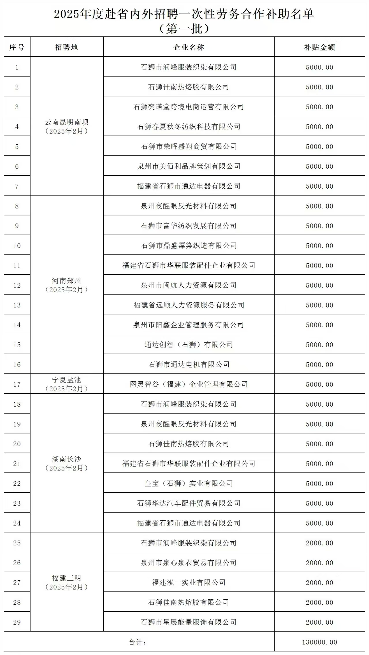 根据《泉州市人力资源和社会保障局 泉州市财政局 泉州市总工会关于印发<2025年“泉就业”扩容提质促发展十条措施>的通知》(泉人社文〔2025〕8号)和《泉州市人力资源和社会保障局关于做好一次性劳务合作补助工作的通知》(泉人社文〔2025〕25号)规定,“对参加由市、县两级政府部门、公共就业服务机构或工会组织赴外地招聘的企业,给予每家企业省外5000元、省内2000元的一次性劳务合作补助。”经过对参加招聘会企业提交的申请材料进行审核,成人网站 润峰服装织染有限公司等29家企业符合申请资格,拟发放一次性劳务合作补助130000元。现将一次性劳务合作补助名单进行公示(详见附件)。