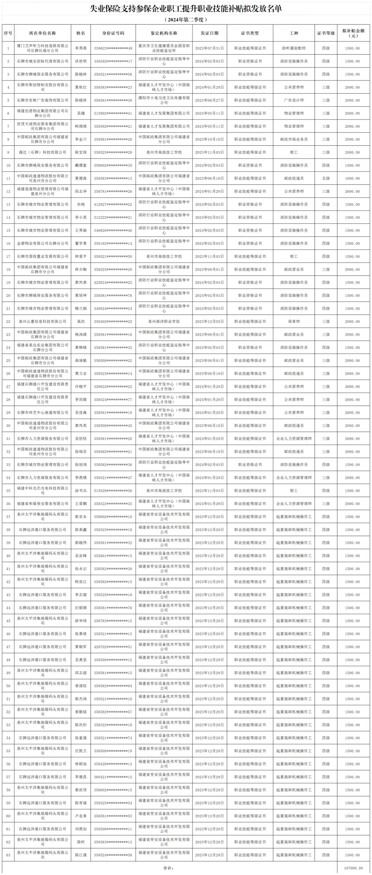 根据《泉州市人力资源和社会保障局 泉州市财政局关于做好失业保险支持参保职工提升职业技能有关工作的通知》(泉人社〔2017〕286号)、《泉州市人力资源和社会保障局 泉州市财政局 泉州市发展和改革委员会转发省人社厅 财政厅 发改委关于进一步做好失业保险支持企业稳定岗位和技能提升有关工作的通知》(泉人社文〔2019〕18号)、《福建省人力资源和社会保障厅 福建省财政厅 国家税务总局福建省税务局关于落实失业保险援企稳岗政策的通知》(闽人社文〔2024〕56号)和《泉州市人力资源和社会保障局 国家税务总局泉州市税务局转发福建省人力资源和社会保障厅 国家税务总局福建省税务局关于明确失业保险省级统筹具体问题的通知》(泉人社文〔2023〕4号)文件规定,开展失业保险支持参保企业职工提升职业技能补贴申请工作,经审核李秀燕等63名职工符合申请技能提升补贴的申请条件,拟发放补贴金额共计107000元。为保证发放程序公开公正,保障失业保险基金安全,现面向社会公示(公示名单详见附件),接受社会监督。
